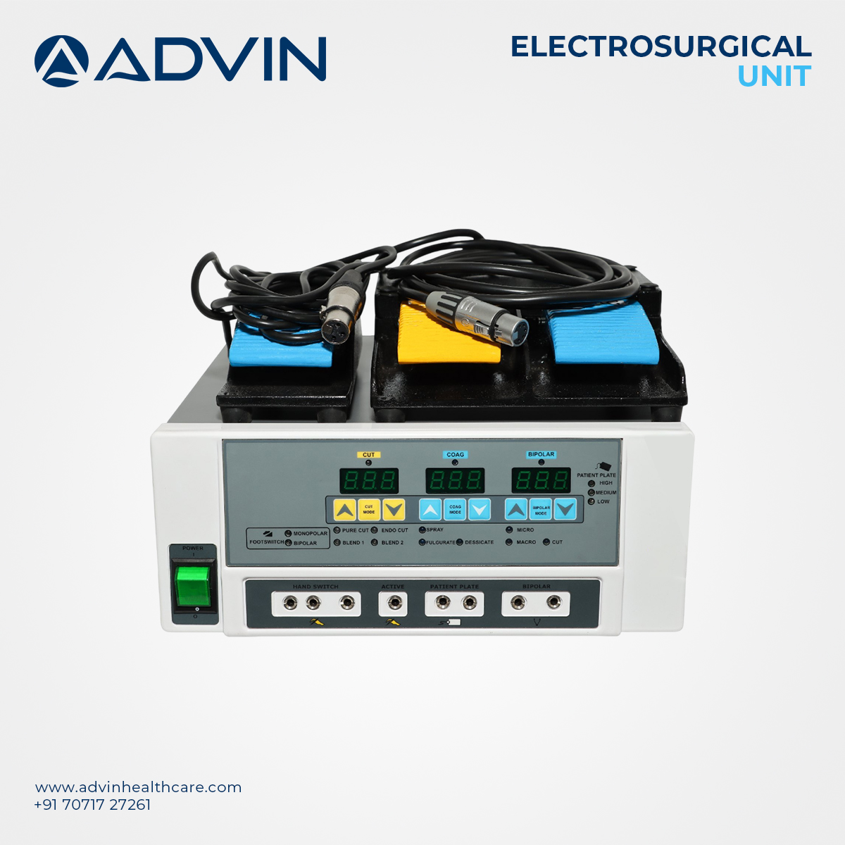 Electro Surgical Unit 400W (Advin Electro +) is a machine used for cutting and coagulation in various surgical applications, very effective and smooth. The isolated bipolar output, which has a non-sparking characteristic, is ideal for microsurgery, Neuro Surgery, Laparoscopy, and other applications.