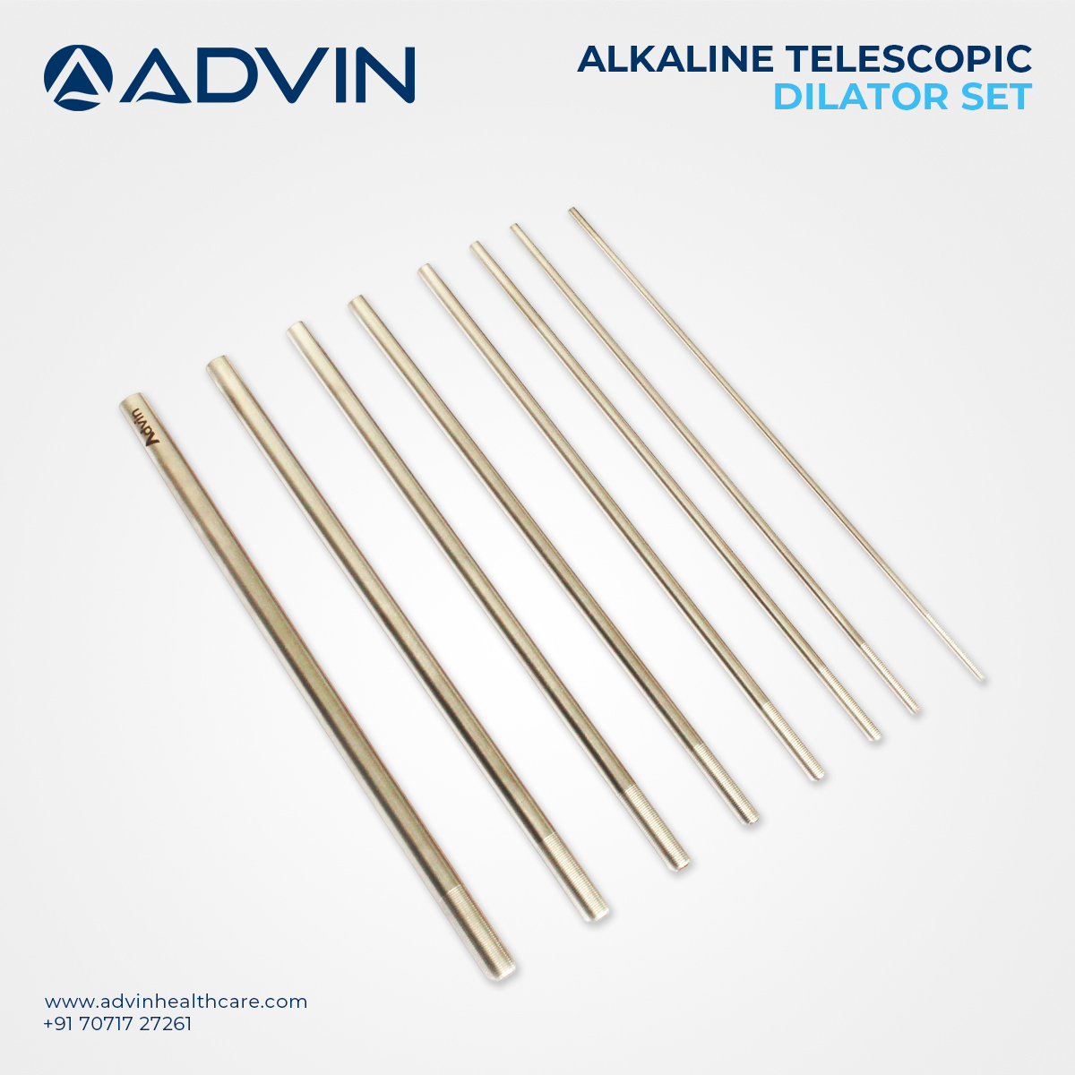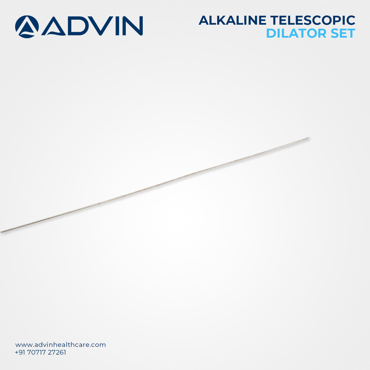 The Alkine Dilator Set, manufactured by Advin Health Care, is a precision-crafted medical tool used in urology for progressive urethral dilation. Designed to reduce trauma and improve access, the set includes a series of dilators with increasing diameters to gently widen narrowed passages. Made from high-grade medical stainless steel, these dilators are autoclavable, corrosion-resistant, and reusable. Their smooth finish and ergonomic handling make them ideal for both routine and complex urethral procedures, providing safety and control during dilation.