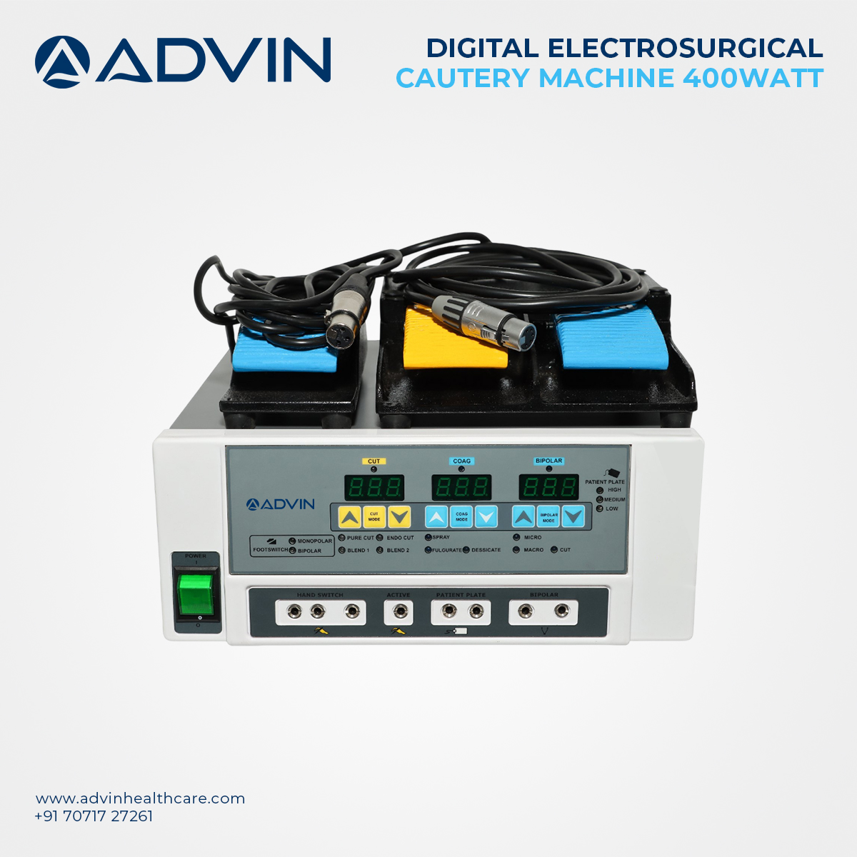 The Advin Electrosurgical Unit 400W – Advin Electro+ is a high-performance surgical device used to cut, coagulate, desiccate, or fulgurate tissue during surgeries. It provides precision-controlled electrical energy to enhance surgical outcomes. This unit is commonly used in general surgery, gynecology, urology, and other medical disciplines.